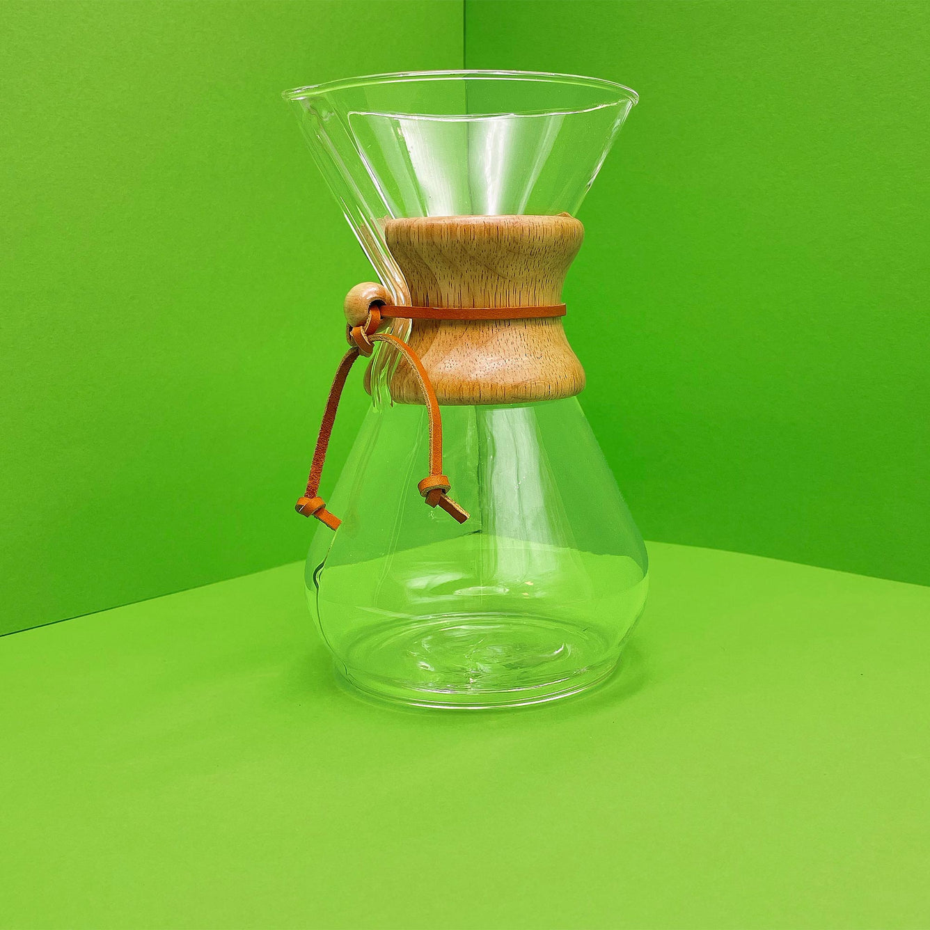 The Chemex Coffee Maker was invented in 1941 by a chemist, Dr. Peter Schlumbohm, and based on his experiences in chemistry. The one-piece hourglass-shaped vessel is made of high-quality heat-resistant glass. A wooden collar with a strap entwines them as a handle. The glass from which Chemex is made does not absorb odors and thus does not affect the taste of the brewed coffee in any way. Production takes place in the United States.