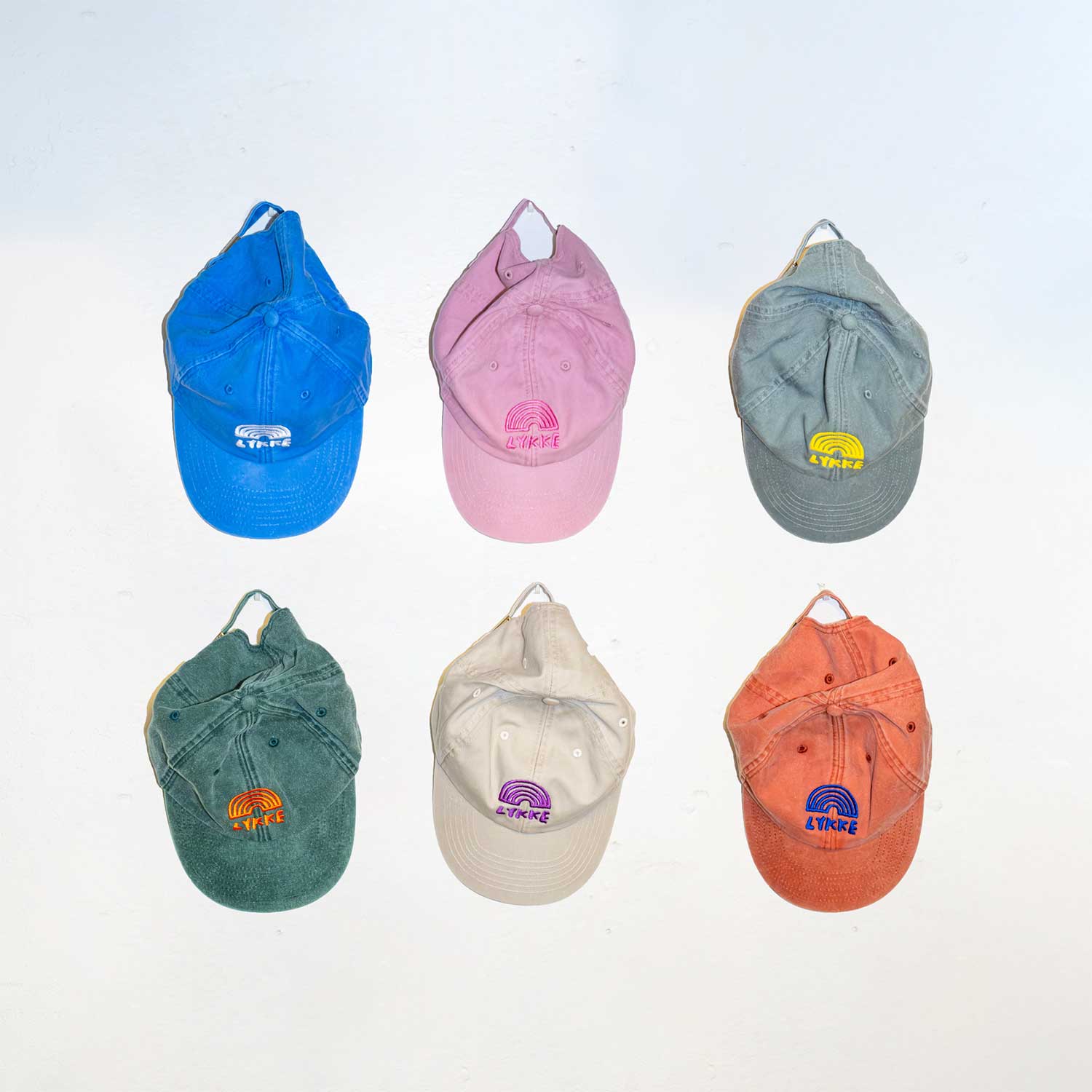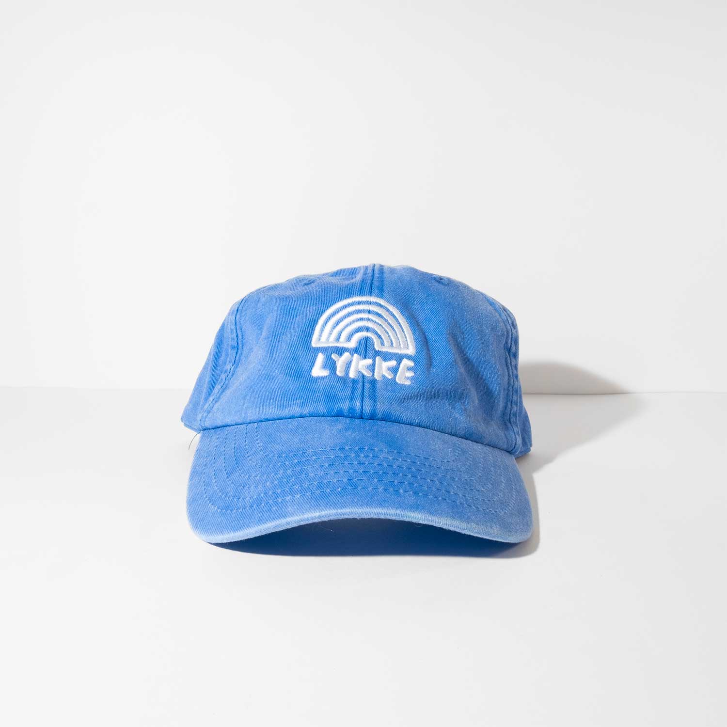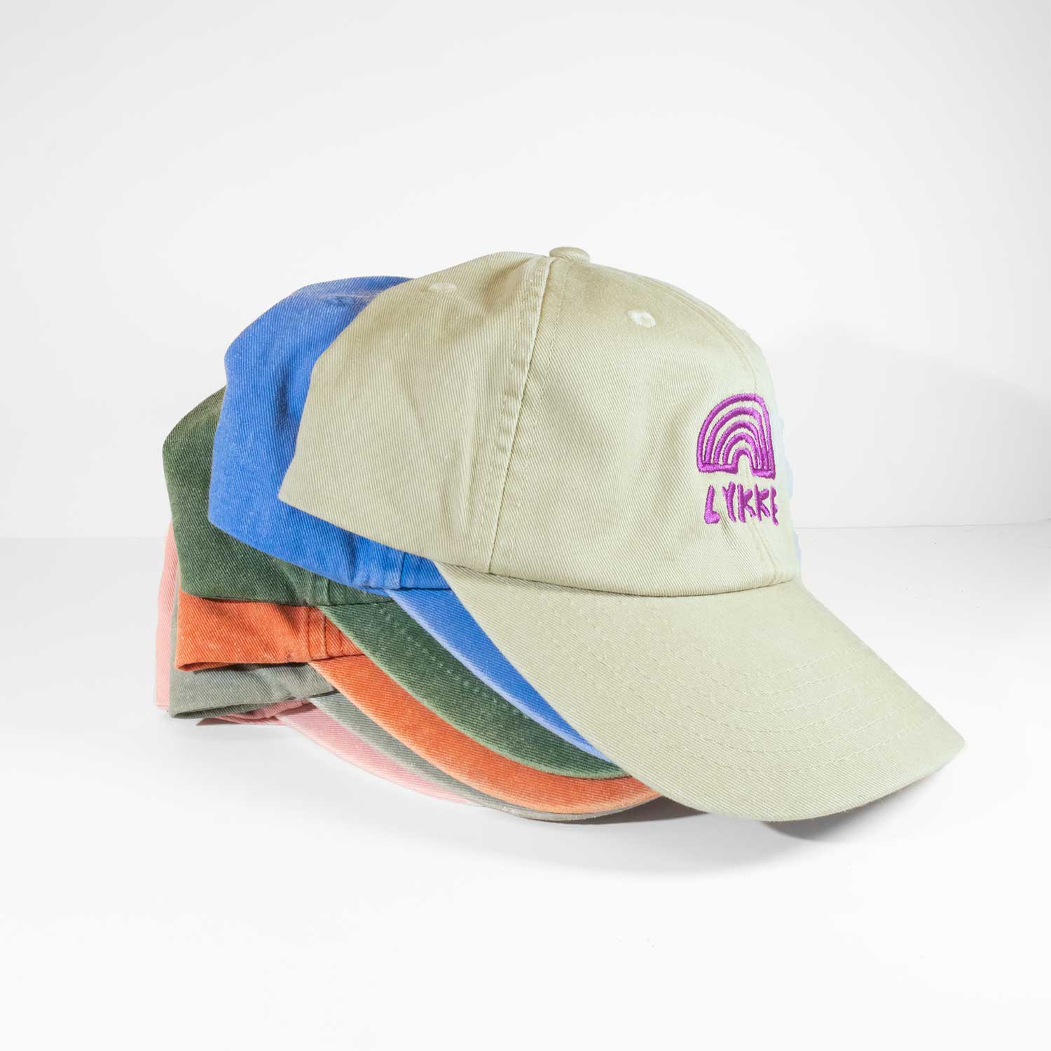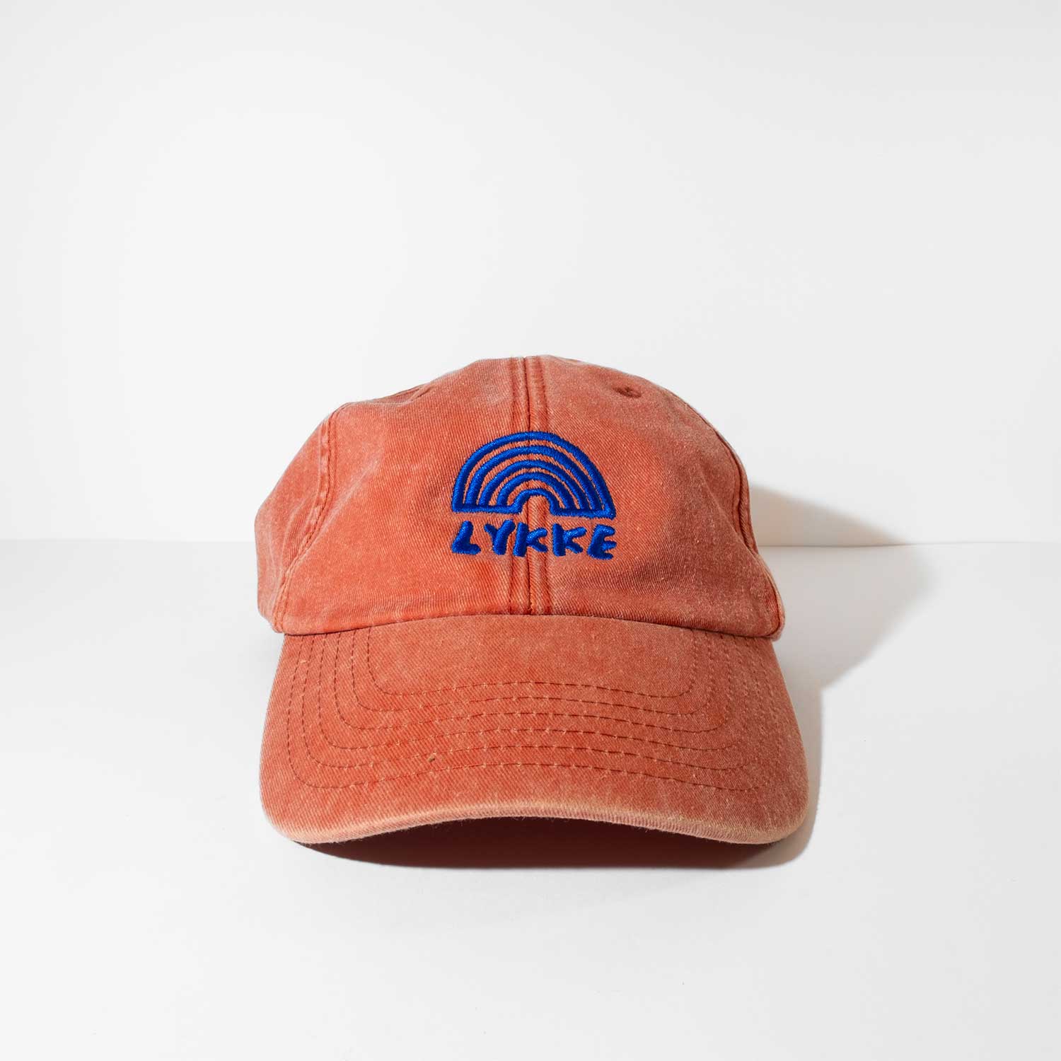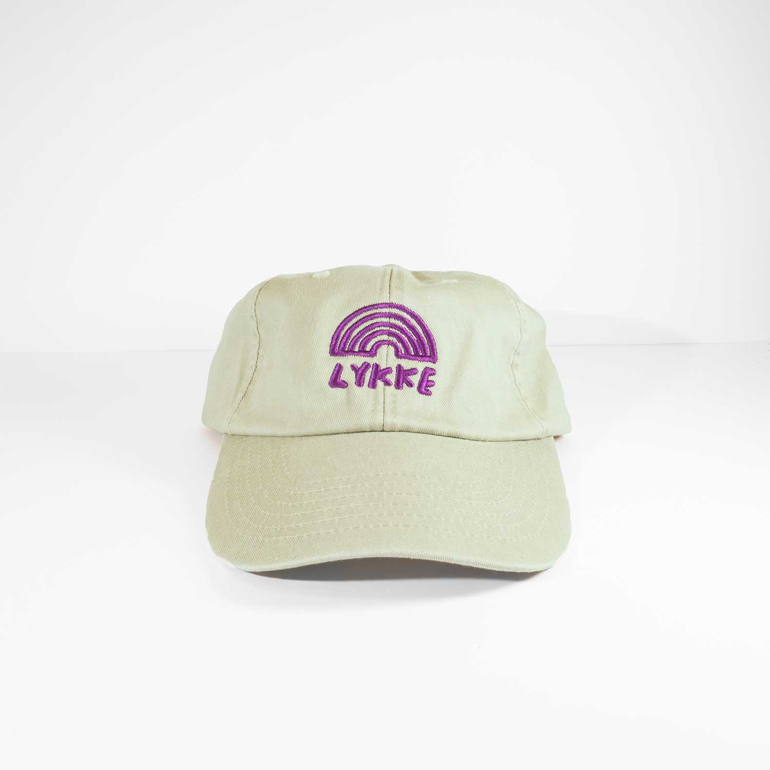 Lykke + rainbow embroidery in the front. One size fits all - adjustable strap.