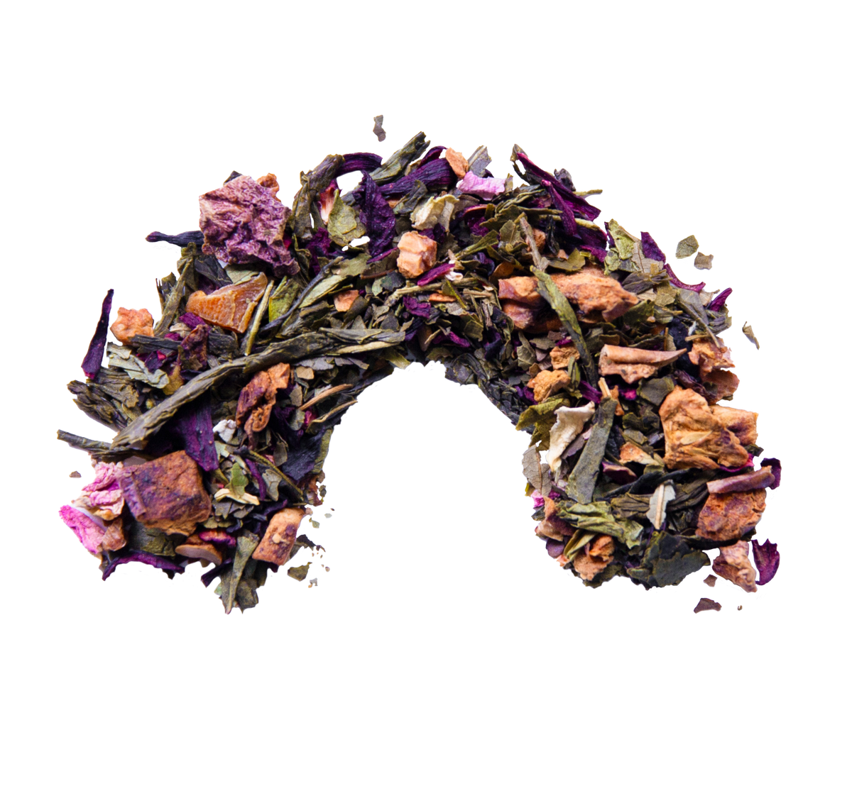 Organic green tea with huge pieces of fruit and rose petals. Like a the tingle of a first-date-kiss, sunrays through golden leaves or the sound of sparkling bubbles in your bath.